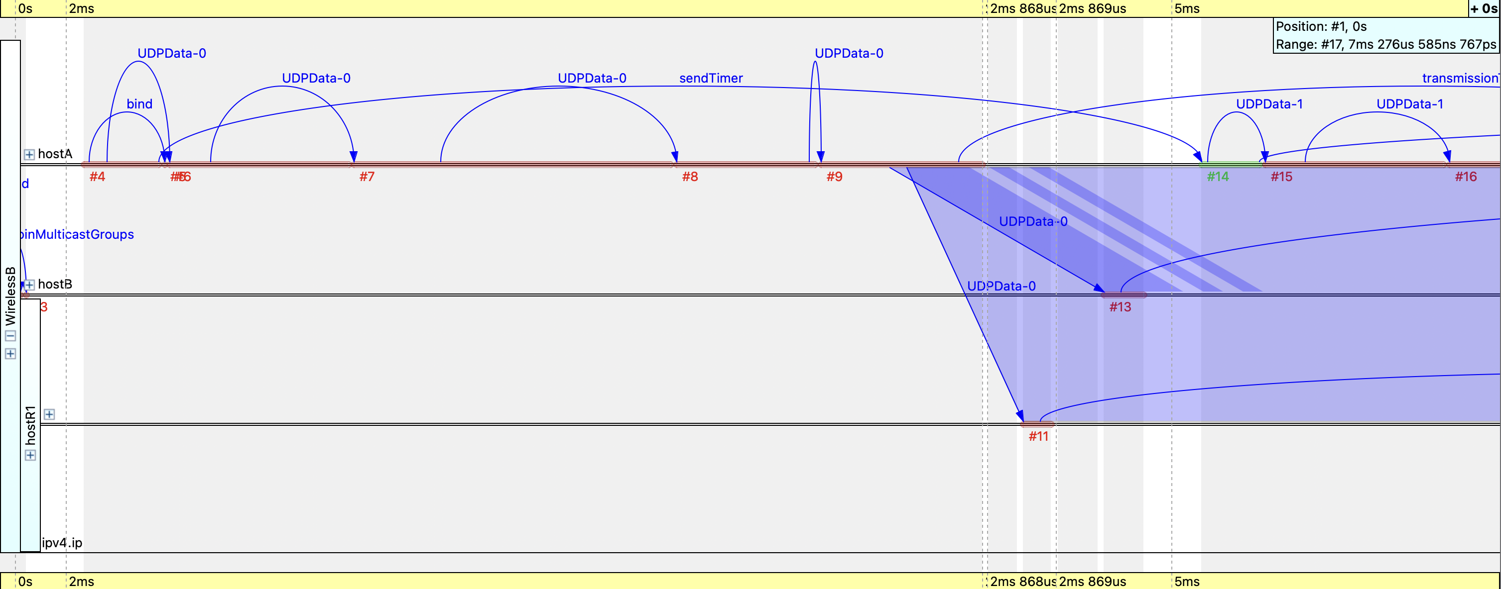 Figure 6 shows the first events of the simulation. At Event #4 it starts with the bind operation for UDPData-0 in hostA. This step represents the initialization of the UDP communication, including the creation of the packet and its preparation for transmission. At this point, the UDPData-0 message is scheduled for delivery, marking the start of its journey from hostA.