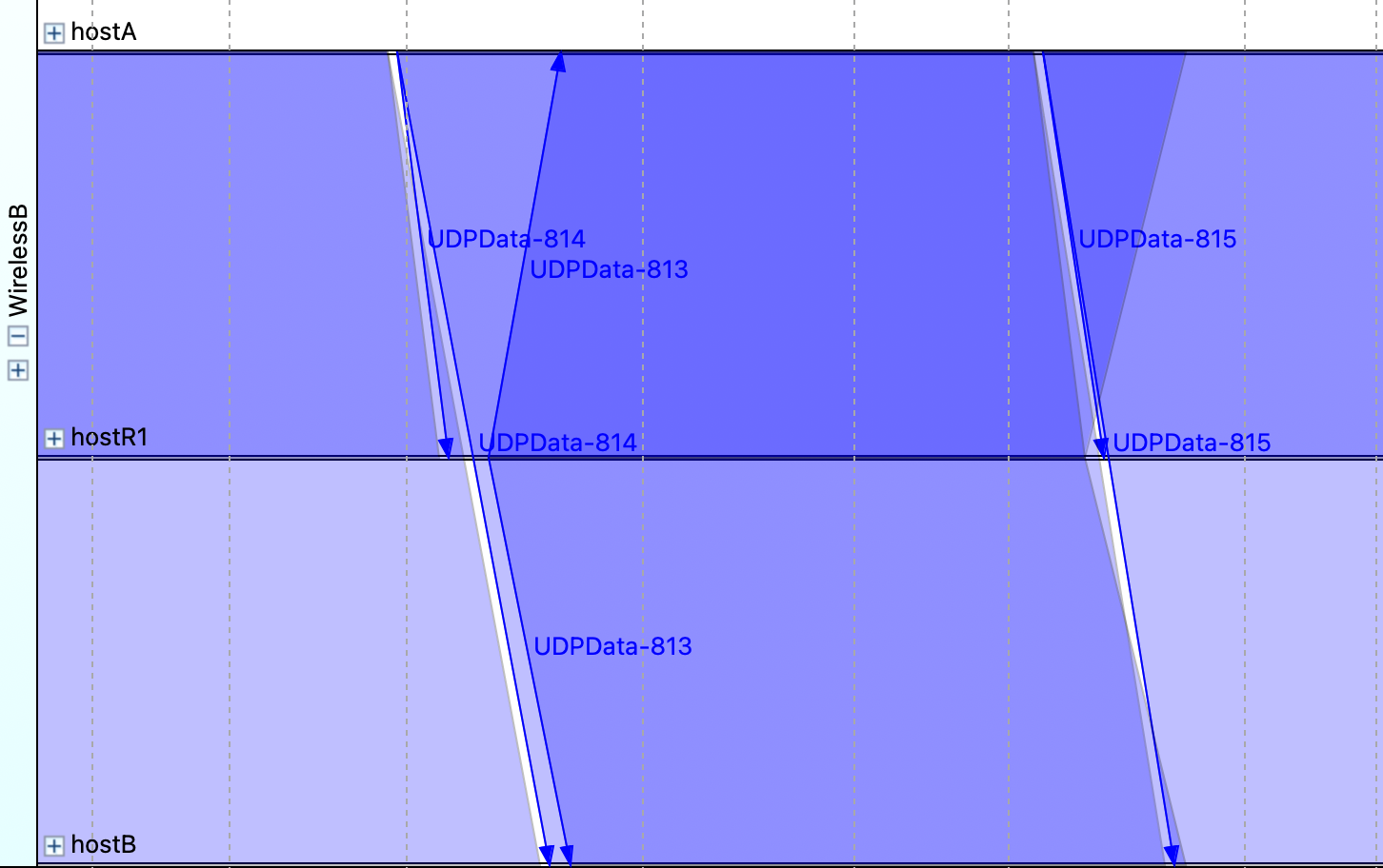 UDPData-813: Successfully reacheshostBafter being forwarded byhostR1. The arcs indicate a complete flow fromhostAtohostBviahostR1.UDPData-814: Is transmitted fromhostAtohostR1but does not reachhostB. The absence of arcs fromhostR1tohostBindicates that the packet was either dropped or lost.UDPData-815: Also fails to reachhostBafter being sent tohostR1. Similar toUDPData-814, the packet appears to have been dropped or interrupted before reaching its final destination.