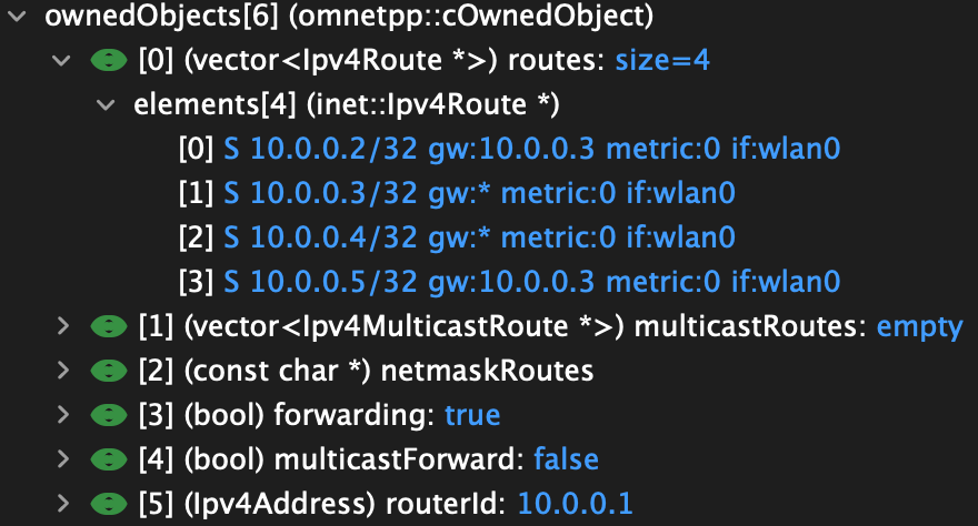 {inet_addr:10.0.0.5/24[...]}Alternatively, the routing table can be viewed in the runtime GUI by selecting the hostA module and clicking on Routing Table in the ipv4 section: