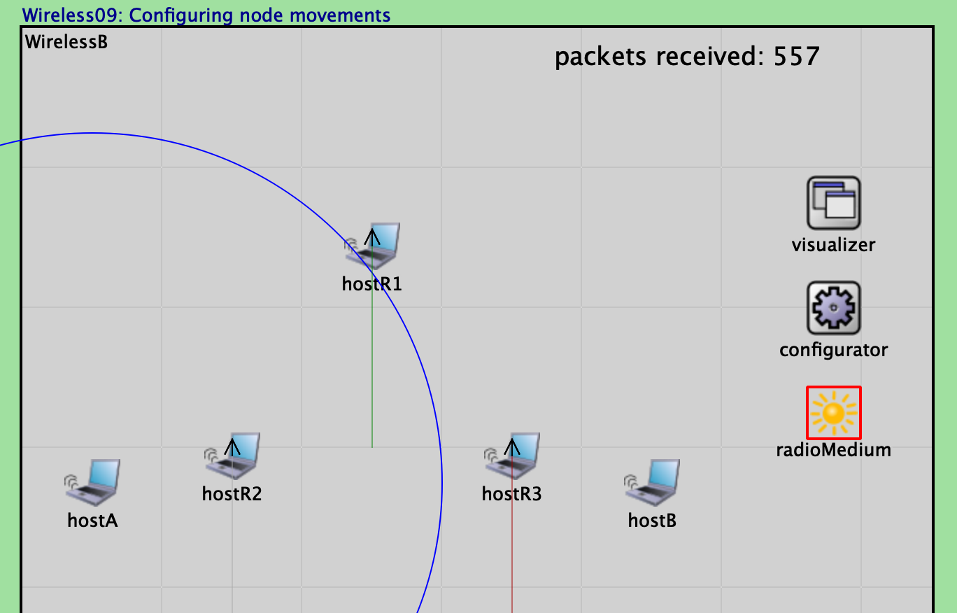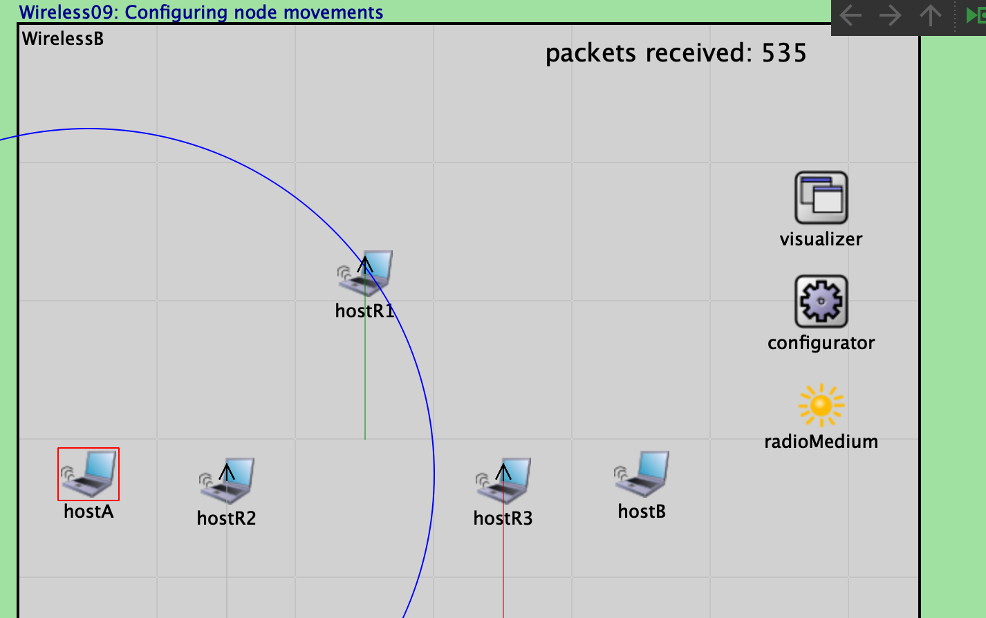 Figure 10 shows the simulation at t=12s, where hostR1 has moved further away from hostA, resulting in complete loss of communication and termination of packet transmission. A total of 557 packets were received by hostB before the transmission stopped.