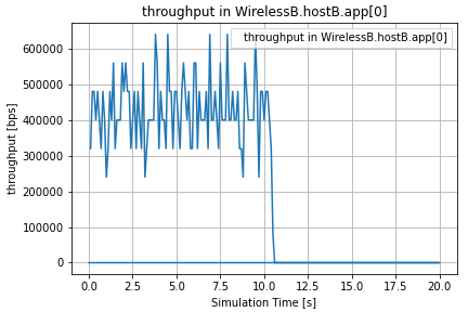 Figure 8 shows the throughput vector at hostB over time. Transmission stops at about t=10.5s, as indicated by the sharp drop in throughput to 0 bps. This corresponds to the moment in the simulation when hostR1 leaves the communication range of hostA, leading to the termination of packet transmission.